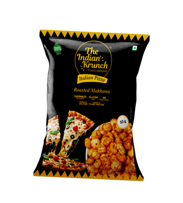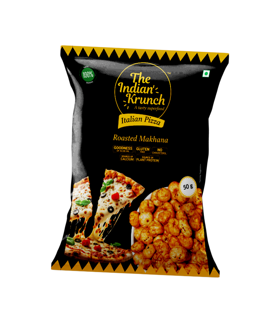 Makhana (Fox Nut), Olive Oil, Rice Bran Oil, Dehydrated Vegetable Powders and Extracts (Garlic, Onion), Sugar, Common Salt, Cheese Powder, Maltodextrin, Spices and Spice Extracts (Chilli, Black Pepper, Cumin), Flavour enhancers (INS 627, INS 631), Acidity regulator (INS 330), Hydrolyzed vegetable protein (Soya base), Paprika Extract (INS 160c), Herb and Herb Extract (Oregano), Anticaking Agent (INS 551), Natural and Nature Identical Flavouring substances (Cheese, Garlic Bread, Butter)